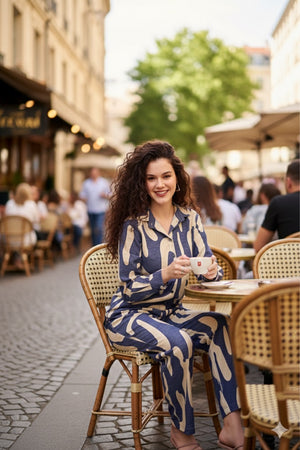 Blue Abstract Flow Co-Ord in flex cotton with a loose-fit shirt and trouser set. Comfortable, breathable, and perfect for casual wear and everyday style.