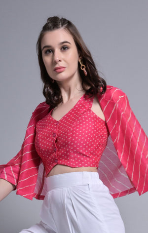 The structured blazer-style top creates a modern silhouette, while the waistcoat design adds versatility—perfect for layering over kurtas, shirts, or dresses. The delicate pink hue brings a graceful, contemporary charm, making it ideal for festive occasions, formal events, and elegant daytime wear.