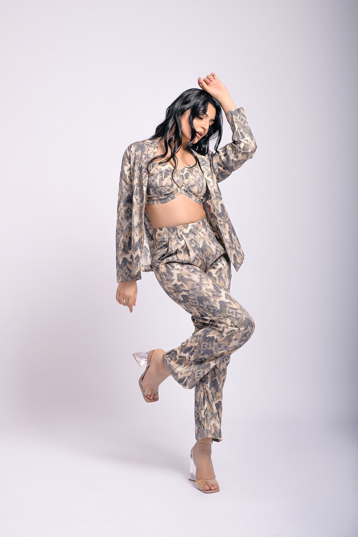 Upgrade your wardrobe with this gray printed 3-piece co-ord, a perfect blend of contemporary design, versatility, and timeless appeal.
