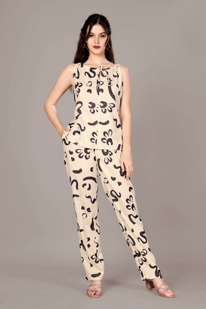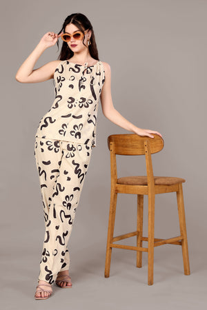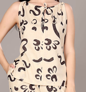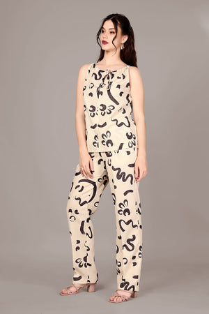 Stylish linen-cotton halterneck top with matching trousers in an off-white abstract print. A versatile, breathable co-ord set perfect for any occasion.