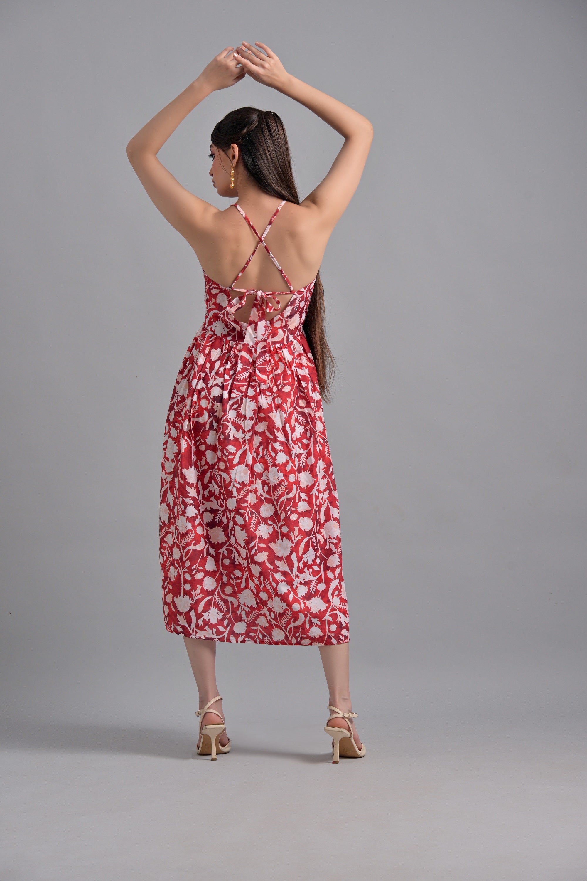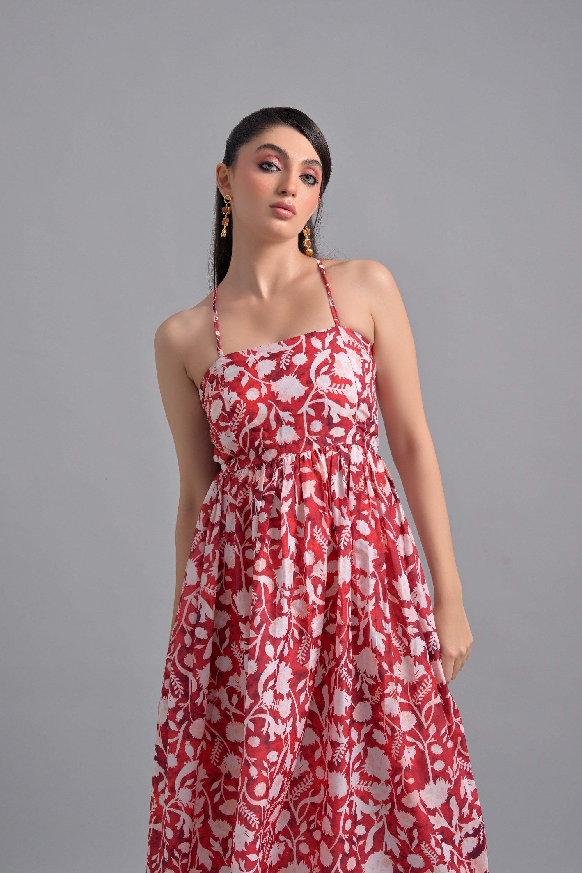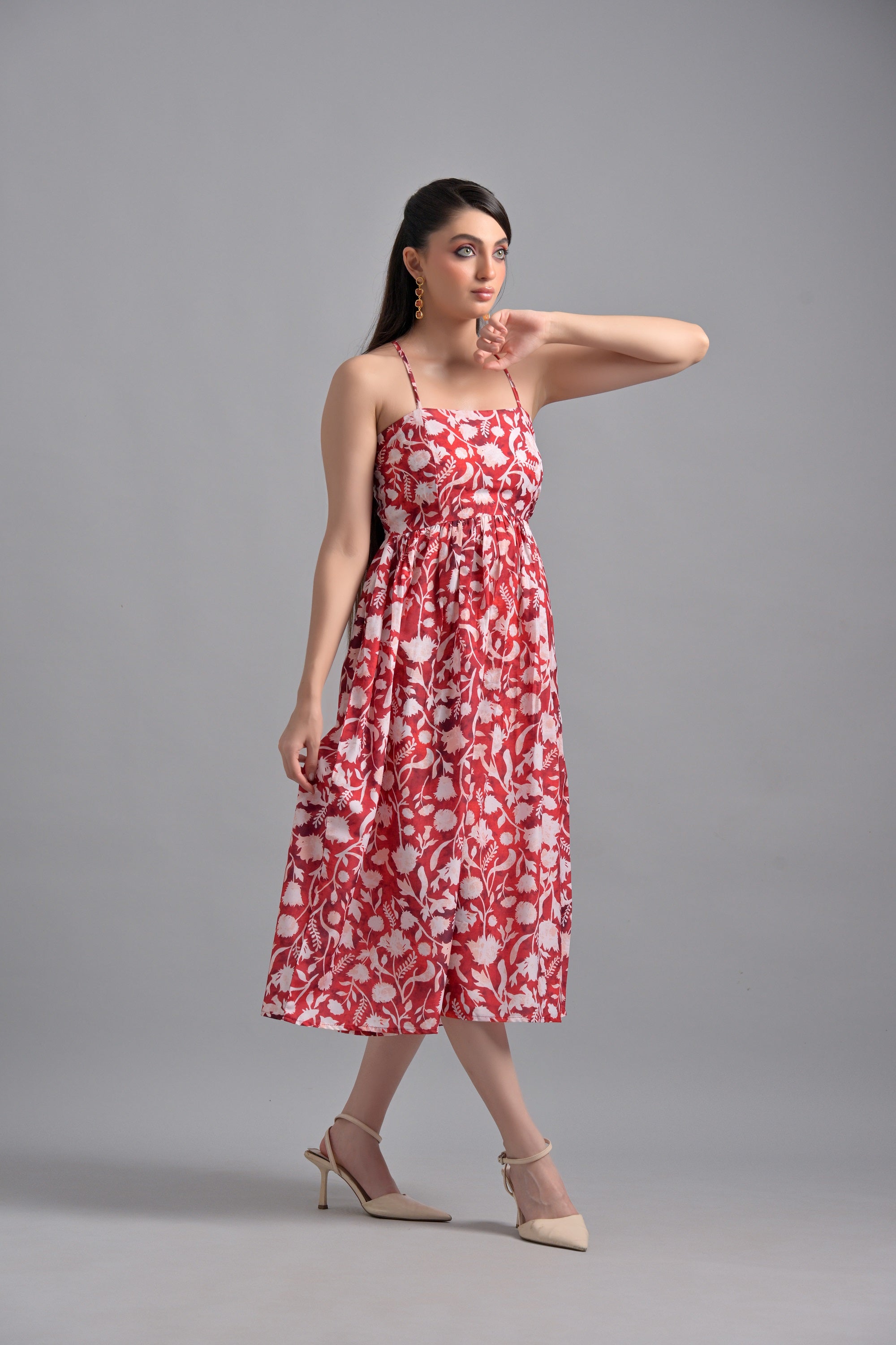 Crafted from lightweight muslin, this red floral dress features a stunning array of blooms. Ideal for those warm weather days, this dress combines comfort and beauty, making it a great choice for any casual or semi-formal event.