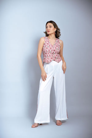 Add a touch of charm to your wardrobe with our Pink Ikat Waist Coat with Trouser set. The delicate pink hue, combined with the traditional Ikat print, creates a stylish and feminine look. Perfect for those who appreciate classic elegance with a modern twist.
